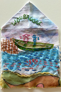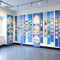 Op linnen lapjes, in de vorm van eenvoudige huisjes, legden deelnemers hun persoonlijke herinneringen vast. Deze vormen samen met leporello’s en foto’s het hart van de expositie. Te zien t/m 11 jan. 2026